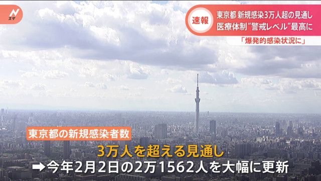東京都では22日、新型コロナウイルスの新規感染者数がおよそ3万5,000人となり、2日連続で過去最多を更新する見通し。