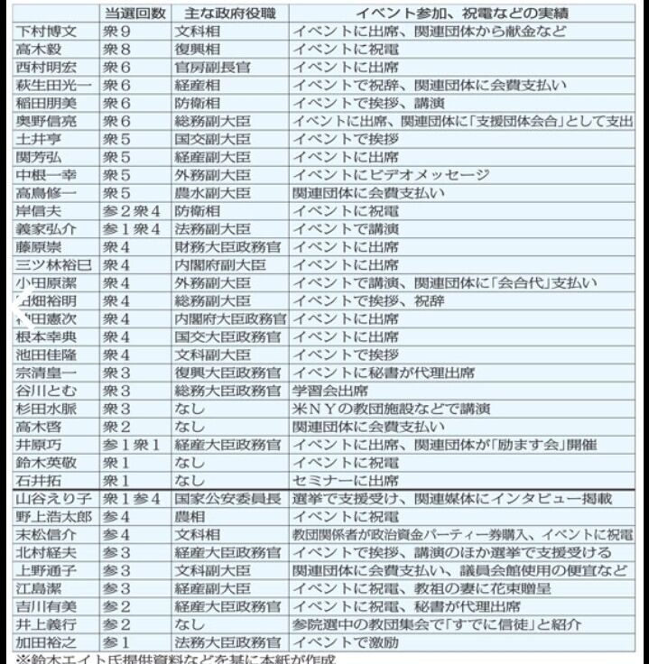 ほかにも慣例により、党や安倍派から離れている細田博之衆院議長(当選11回)も関連イベントに出席、講演を行った過去もある。安倍側近でありながら、出戻りが難航している高市早苗政調会長(当選9回)は、フロント団体「天宙平和連合」の行事に祝電を送っていた。安倍元首相が昨年9月にビデオメッセージを送り、銃撃の要因のひとつとなったのも、この団体のイベントだった。