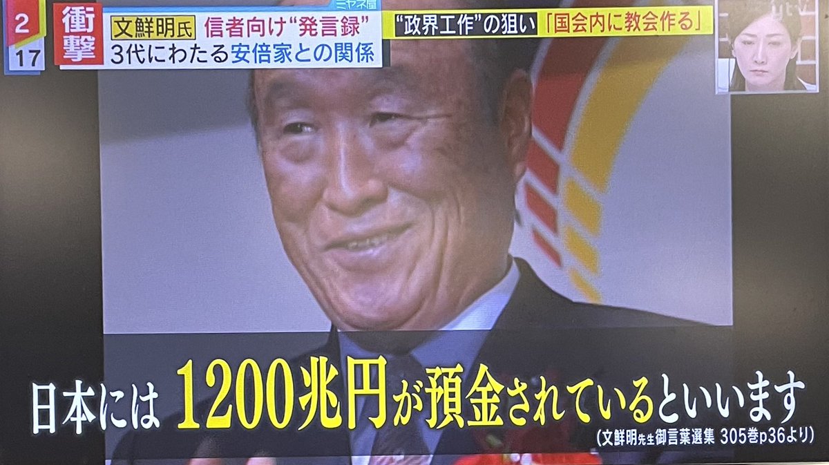 さらに文氏は福田赳夫氏(享年90)、中曽根康弘氏(享年101)を首相にしたのは教団の支援があったからだとも発言。また、「日本には1200兆円が預金されているといいます」「それは誰のためですか? 皆さんのためのものです」「日本人たちは本当に使いがいがある」など驚愕の見解もつづられていたという。