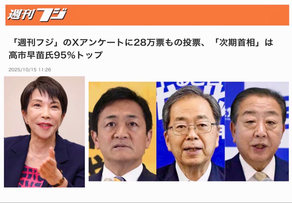 「週刊フジ」のXアンケートに28万票もの投票、「次期首相」は高市早苗氏95%トップ https://t.co/PyDKvjjXdH @Sankei_newsより pic.twitter.com/0m8145qA9j