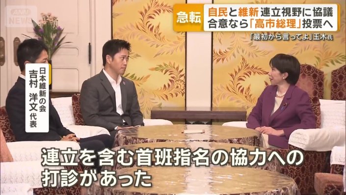 本日、東京での党首会談において、高市新総裁から、連立入りの打診と首班指名への協力要請がありました。我々政治家は評論家ではありません。政党として公約を実行すること、有権者との約束を果たすこと、自らの政治信念を貫くことにあると思います。そこをぶらさずに、明日から政策協議に入ります。