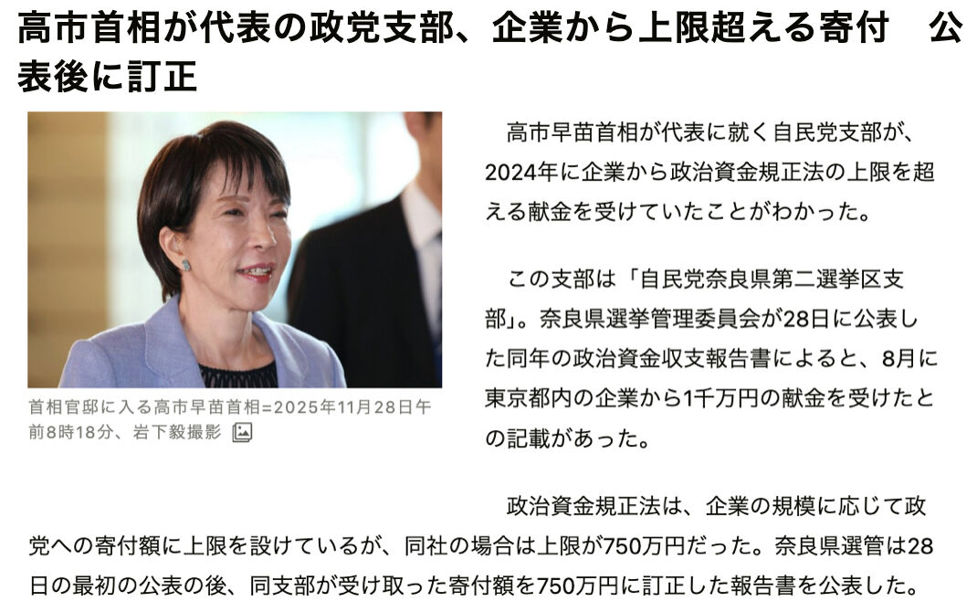| 高市首相が代表の政党支部、企業から上限超える寄付 公表後に訂正 高市早苗首相が代表に就く自民党支部が、2024年に企業から政治資金規正法の上限を超える献金を受けていたことがわかった。 この支部は「自民党奈良県… (出典:朝日新聞) |