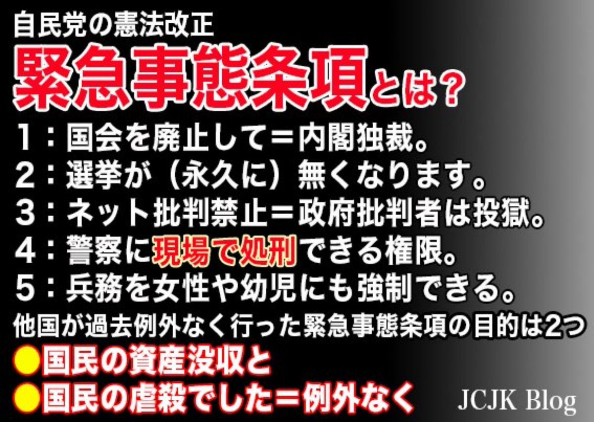 緊急事態条項は独裁条項とも呼ばれ、これまで三権分立で権力を分散させていたものを1つに集約させ、内閣だけでルールを作れたり、予算を決められたり、地方の下部組織を自在に操れる、「魔法の杖」だ。憲法すら守れない政府に与えてはいけない。