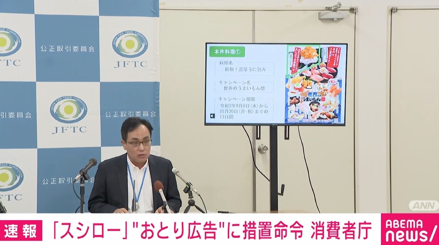 時事通信によると、ウニやカニを用いた目玉商品を、実際には在庫がないのに販売しているかのように宣伝していたとして、消費者庁は「スシロー」の運営会社あきんどスシローに対し、景品表示法違反(おとり広告)で再発防止を求める措置命令を出したそうだ。