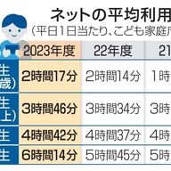 | 高校生のネット利用が6時間超え 10歳の65%が自分専用スマホ 1日当たりのインターネット利用時間(平日)は高校生が6時間超、中学生が4時間半超、小学生が3時間半超で、目的は動画の視聴がトップ―。こども家庭庁の… (出典:共同通信) |