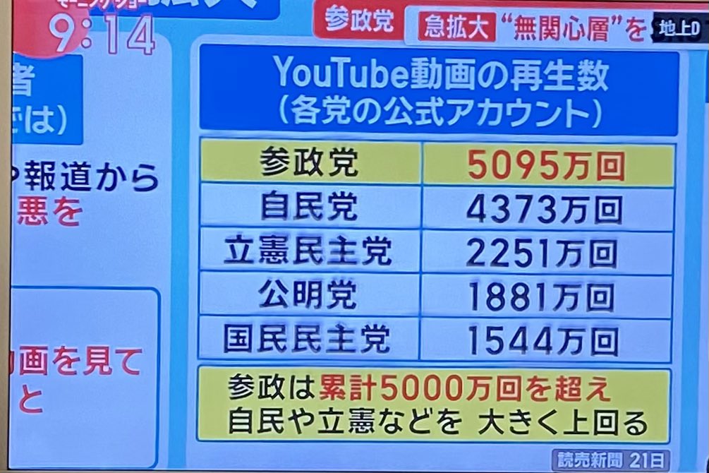 何でれいわのYouTube再生回数を出さないんだろう?#モーニングショー #参院選 pic.twitter.com/QoxNz7UF0B
