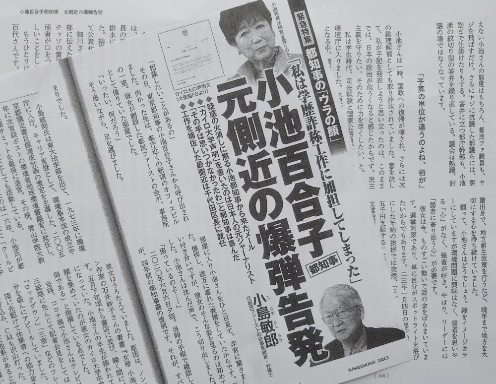 | 「学歴詐称疑惑」再燃で国政復帰が黄信号!?…本誌直撃に小池百合子・東京都知事の「ズレた返答」 …ていないからでないか。経歴詐称の時効は3年。次に立候補して選挙公報に『カイロ大学卒業』と記せば、公選法の虚偽事項公表罪にあたる。刑事告発も視野に入れている」… (出典:FRIDAY) |