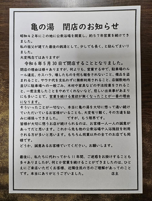 一部のルールを守れない客が原因で亀の湯を閉店するとのこと。自民党も同じだよな。増税、ワクチン推し、マイナ保険証、裏金問題など迷惑行為ばかり。自民党も閉店発表したら?