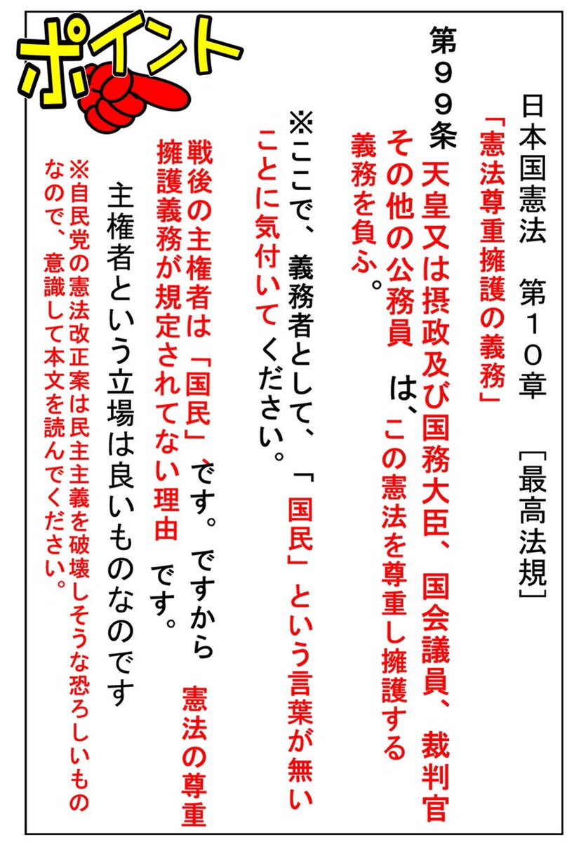| 日本国憲法 > 日本国憲法第99条 日本国憲法 第99条(にほんこく(にっぽんこく)けんぽう だい99じょう)は、日本国憲法の第10章にある条文で、天皇(又は摂政)と全ての公務員が憲法を尊重し擁護する義務があることについて規定している。 日本国憲法、e-Gov法令検索。 第九十九条… 14キロバイト (1,952 語) - 2024年7月30日 (火) 15:56 |
